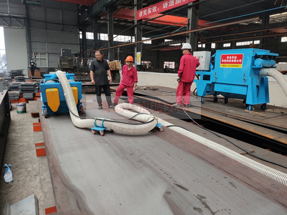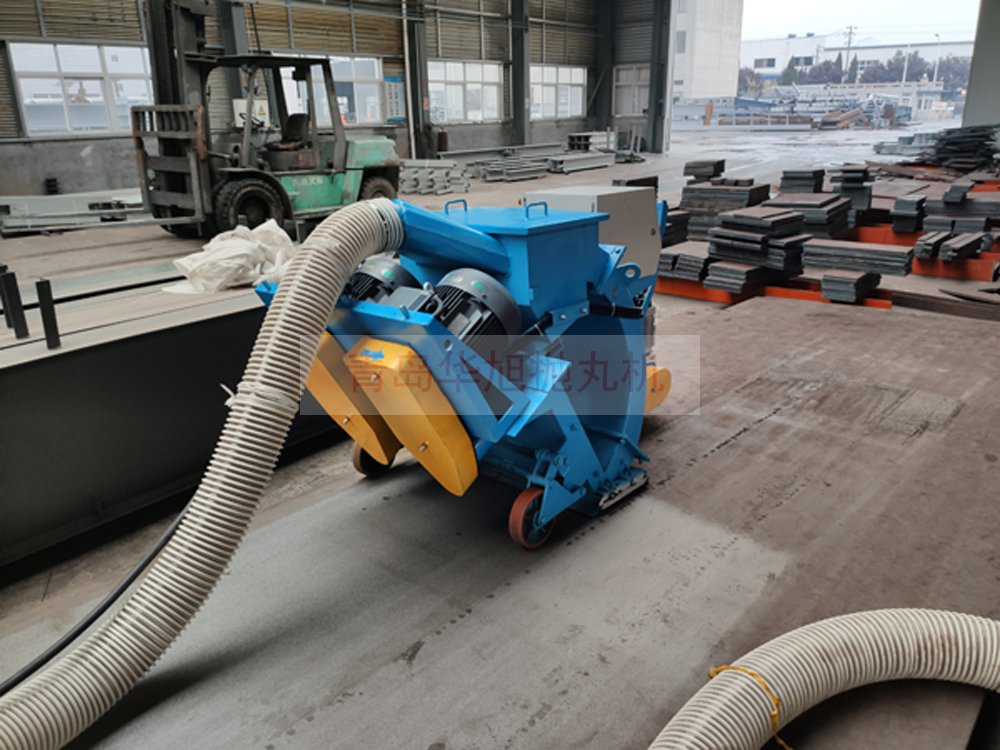 客戶訂購的移動式鋼板拋丸機(jī) 調(diào)試現(xiàn)場除銹效果